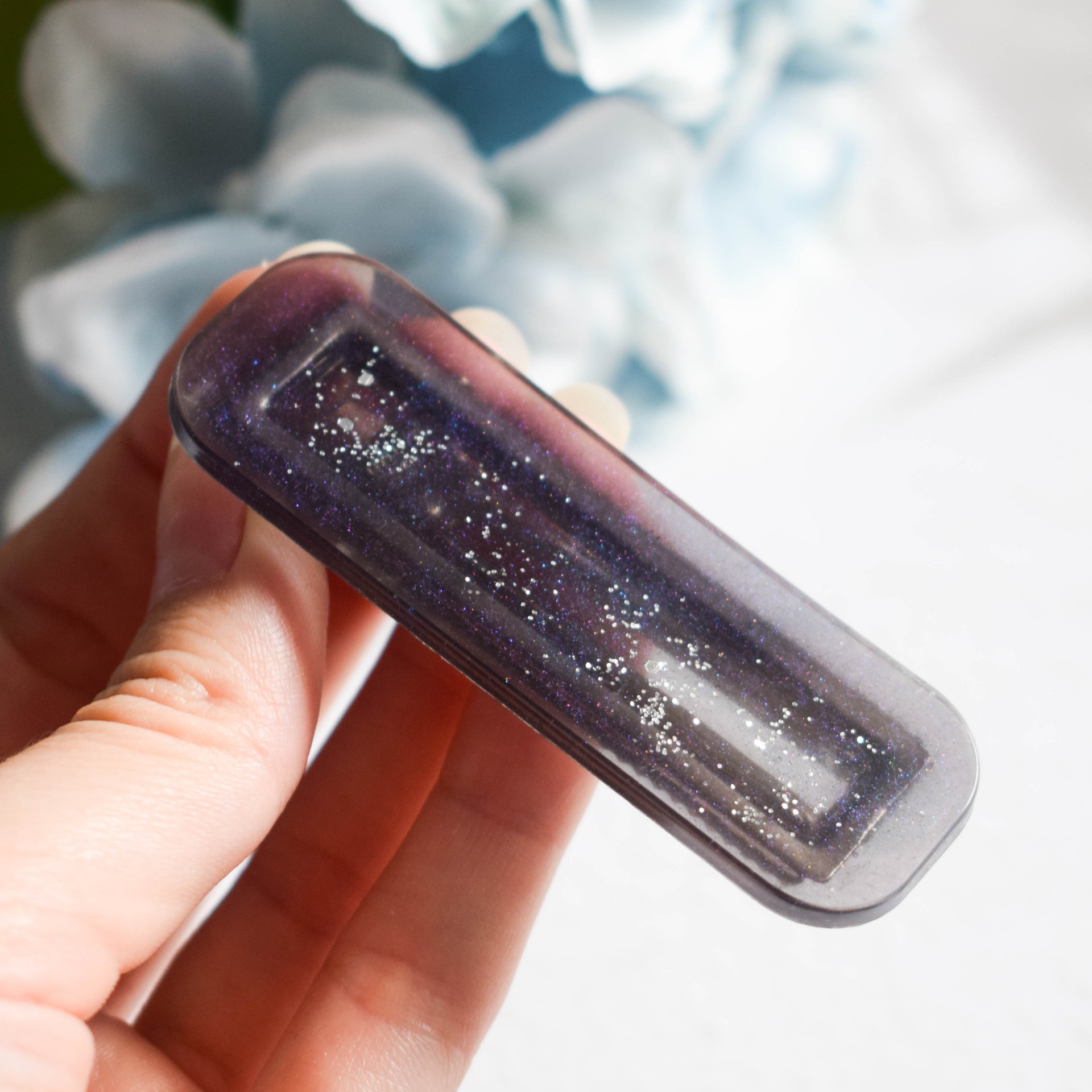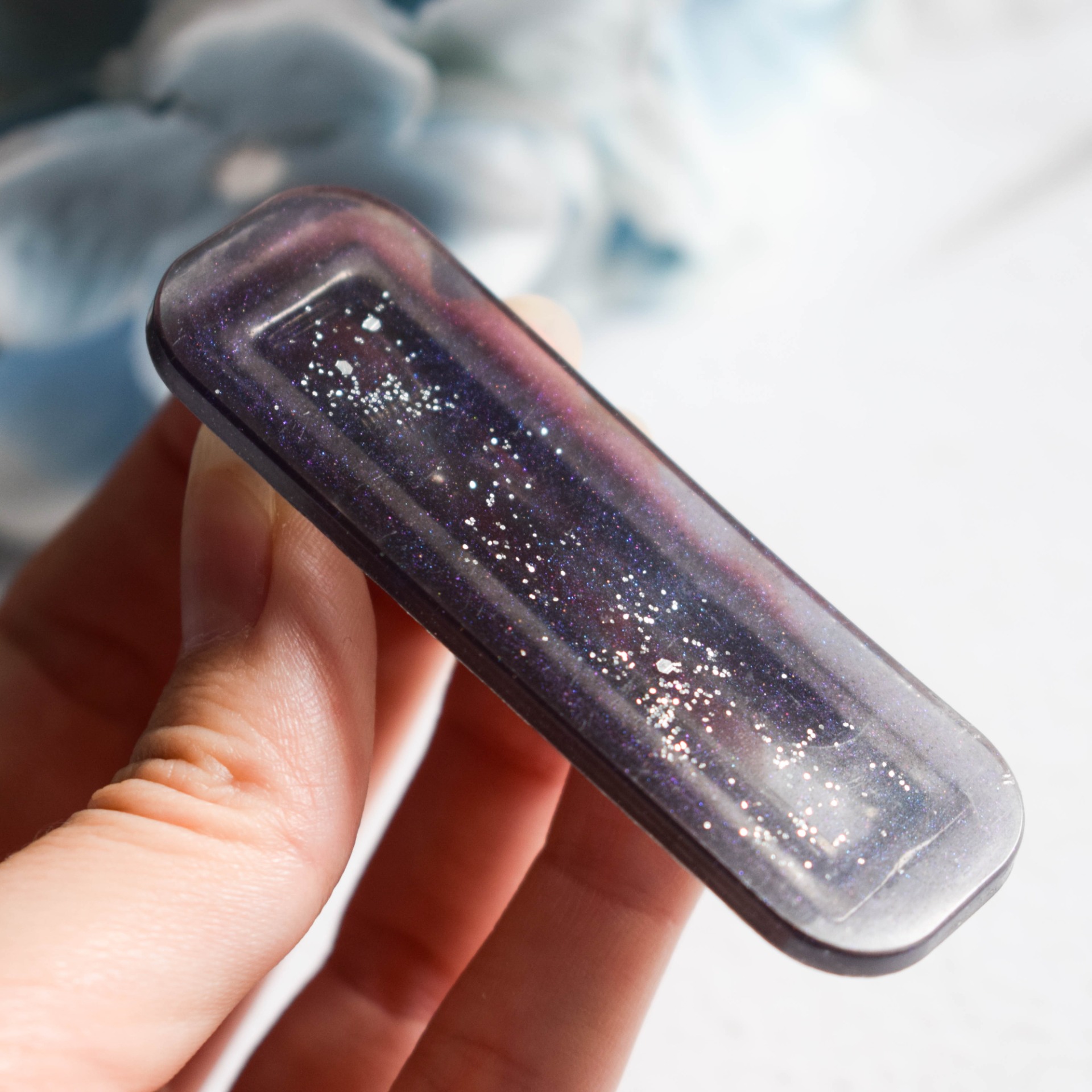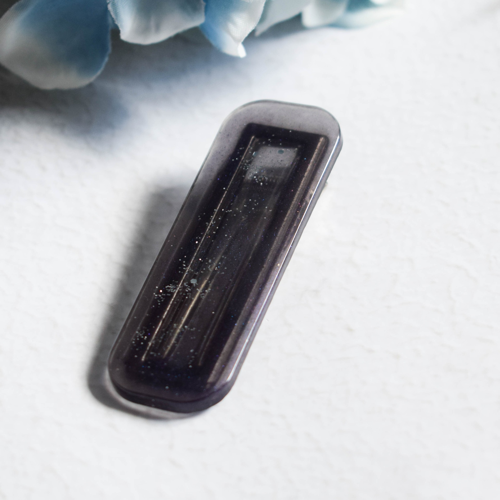 Tato spona do vlasů, z epoxidové pryskyřice, kombinuje moderní styl s jemným třpytem, který dodá vašemu účesu tajemnou hloubku.