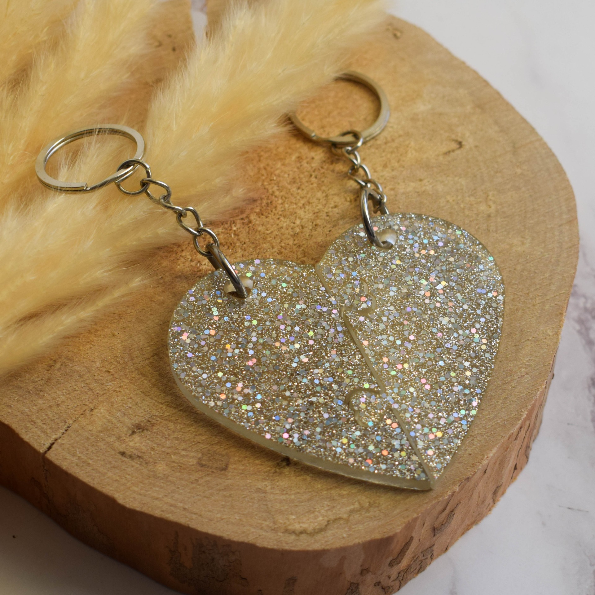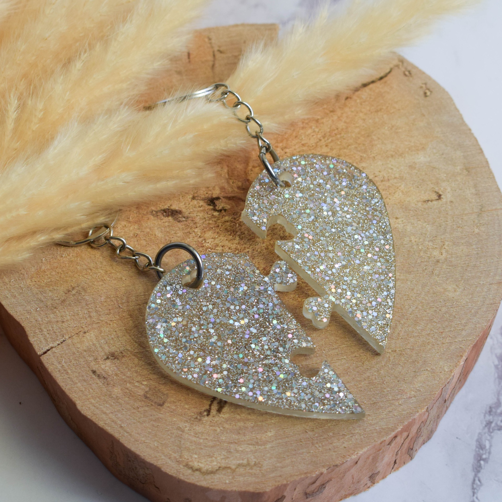 Sada dvou klíčenek v podobě půl srdíček vyrobena z epoxidové pryskyřice. V designu s holografickými glitry.