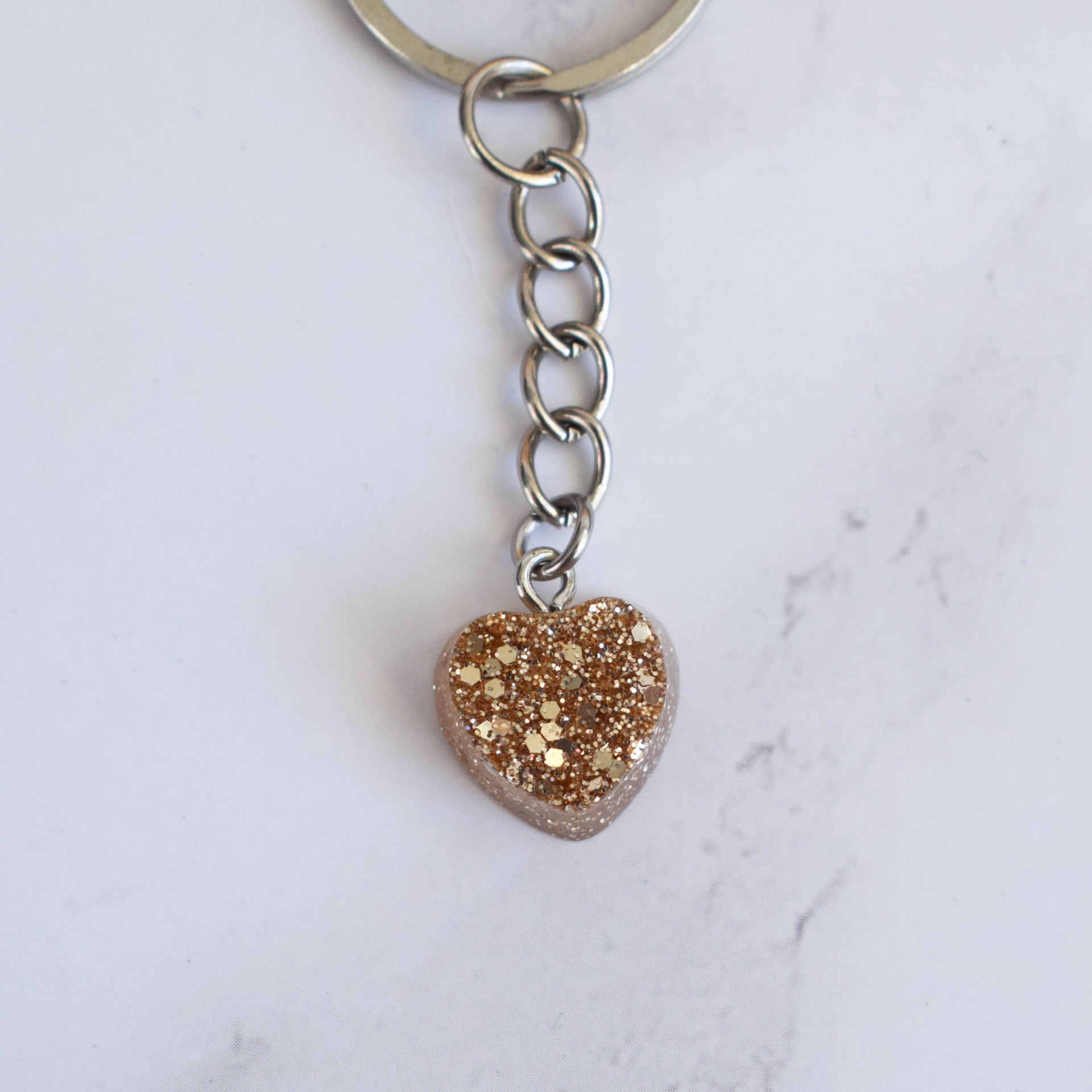 Klíčenka ve tvaru srdíčka, v designu se zlatými třpytkami.