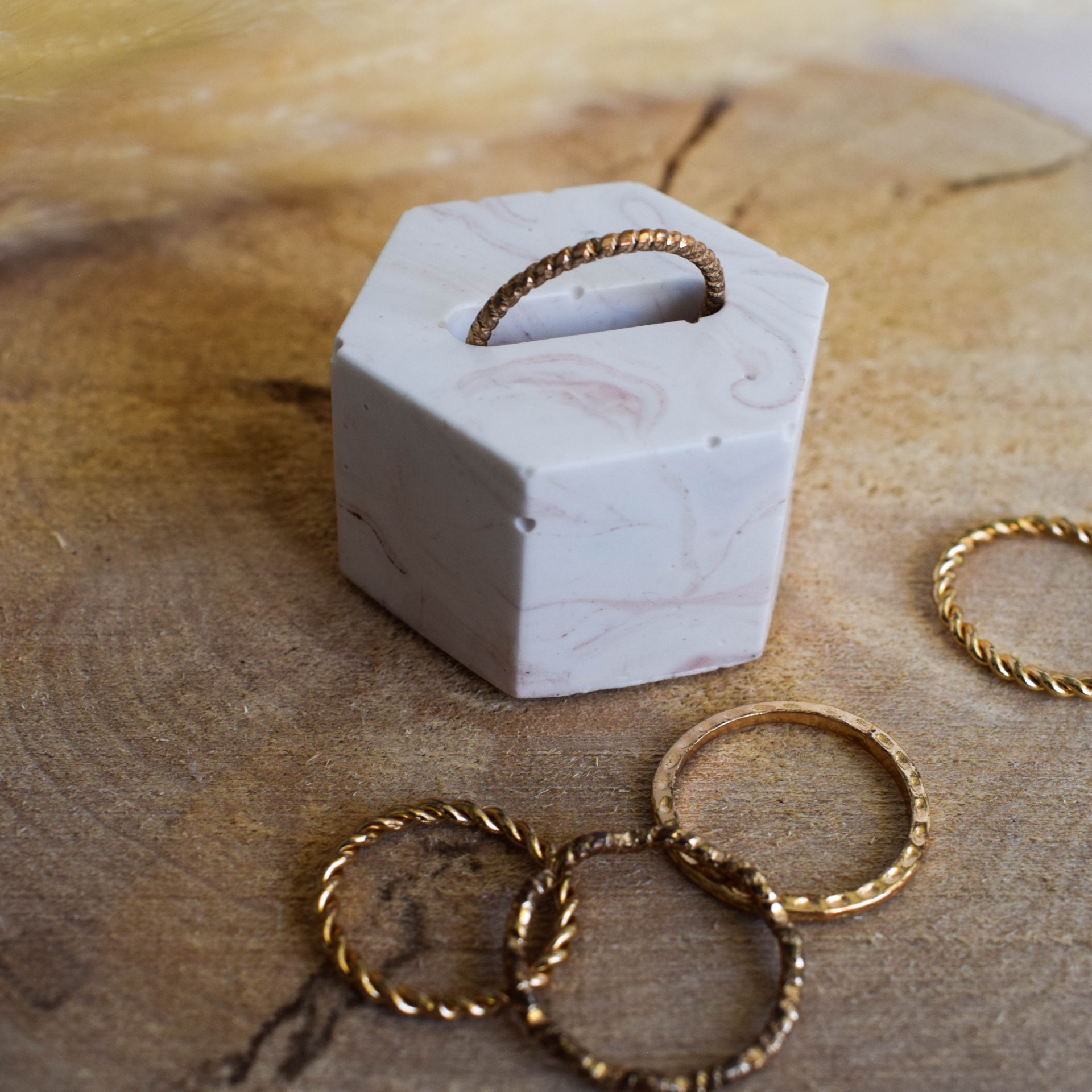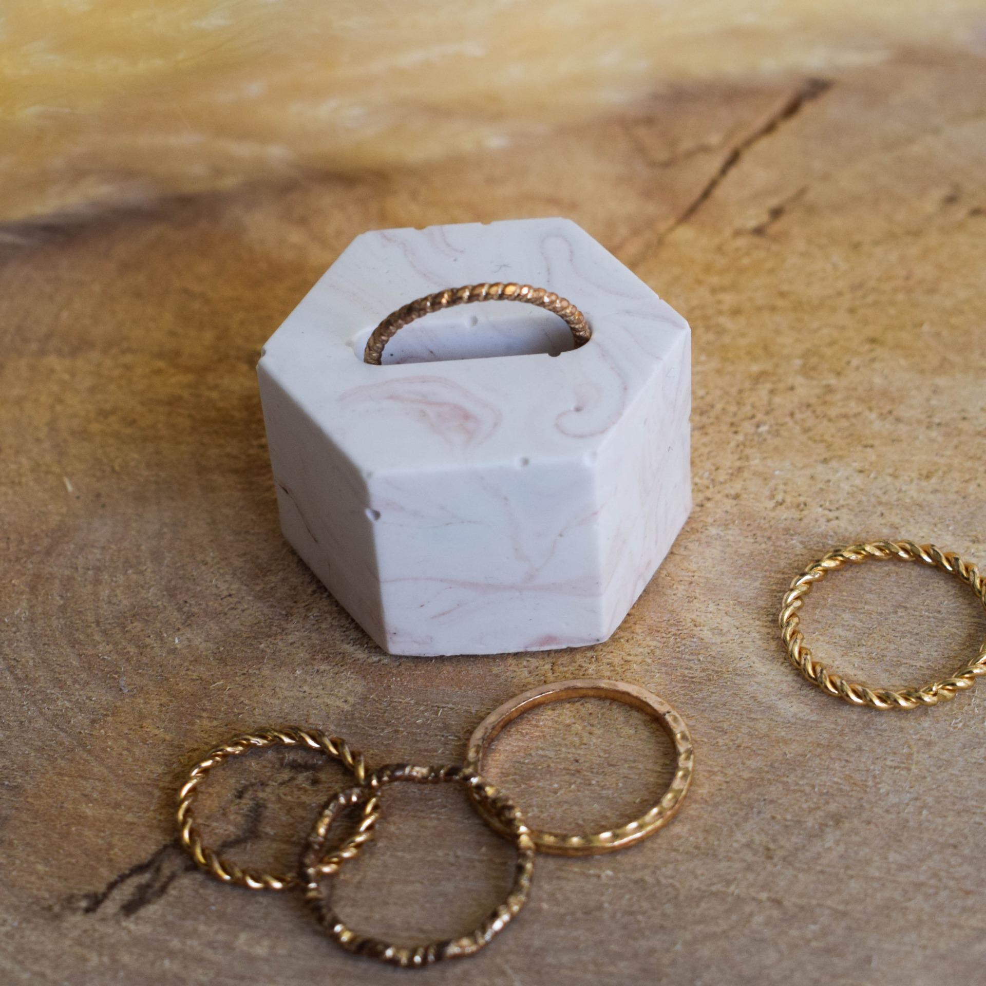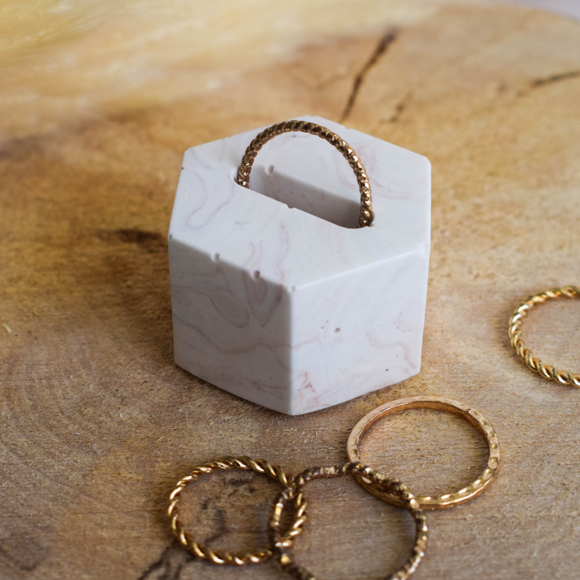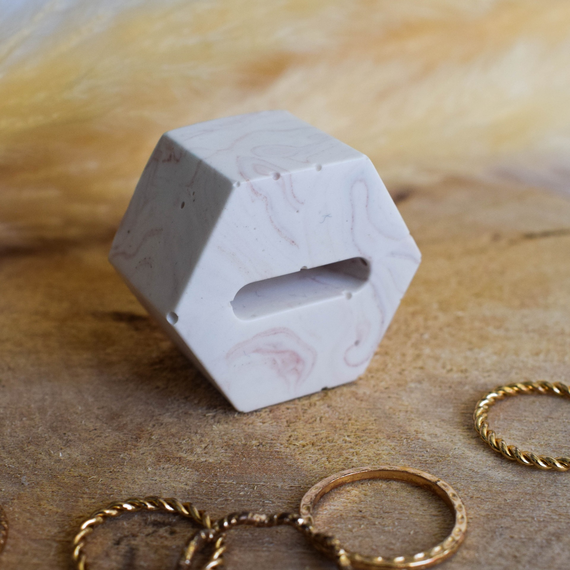 Stojánek na prstýnek vyrobený z jesmonitu v designu jemného cihlového mramoru. Do stojánku lze položit jeden prstýnek.