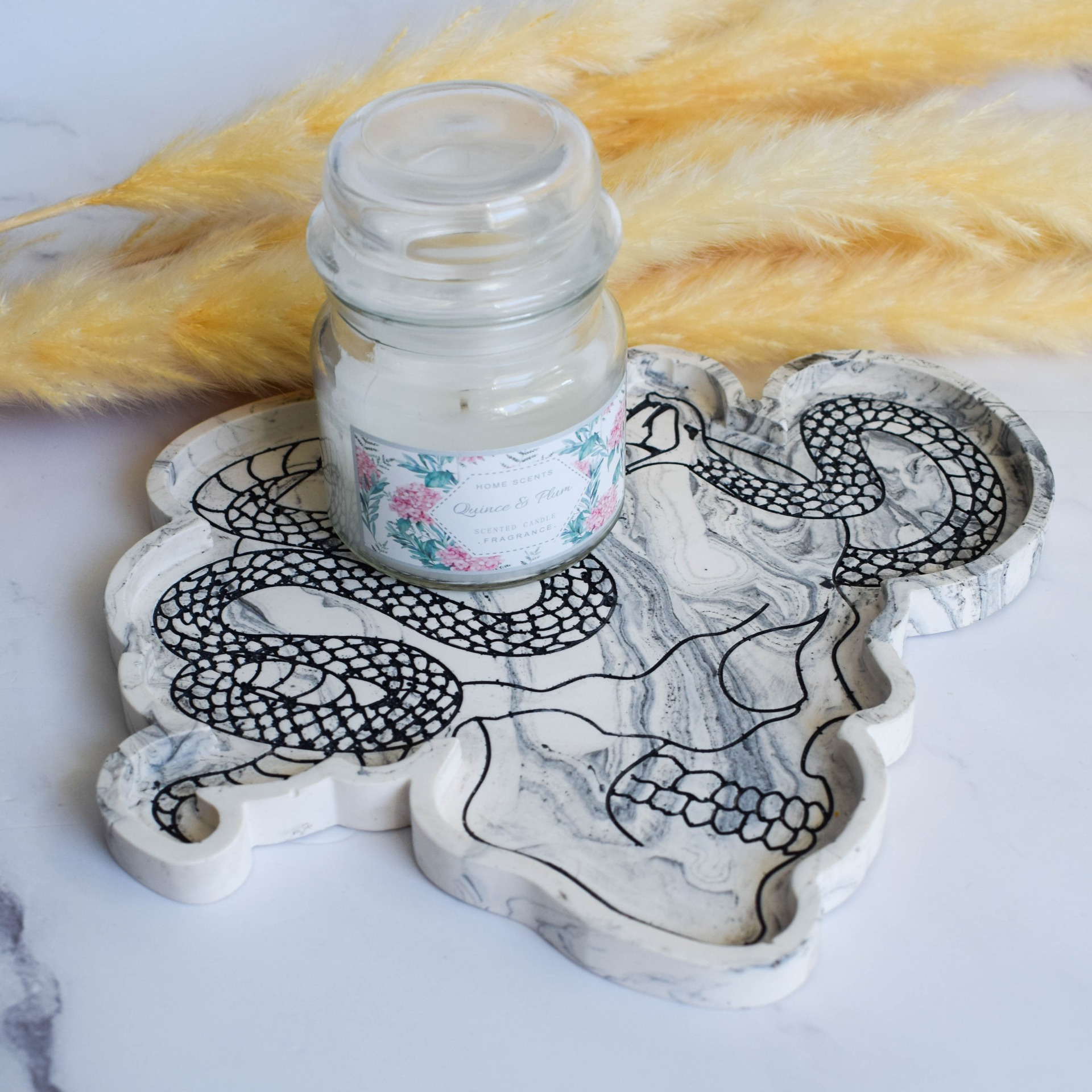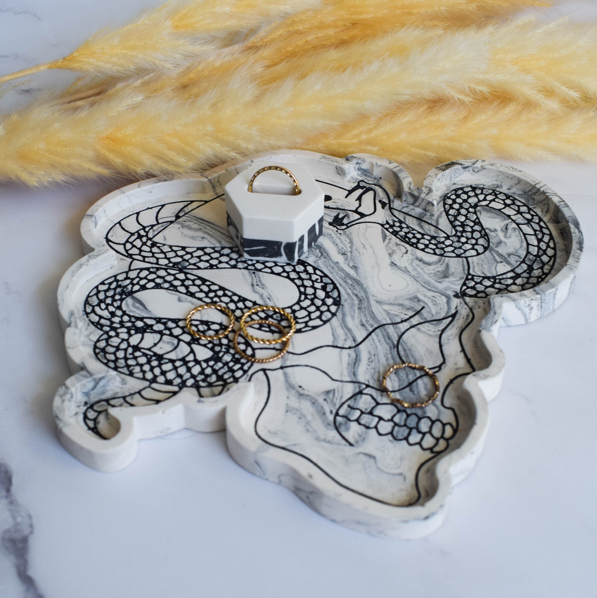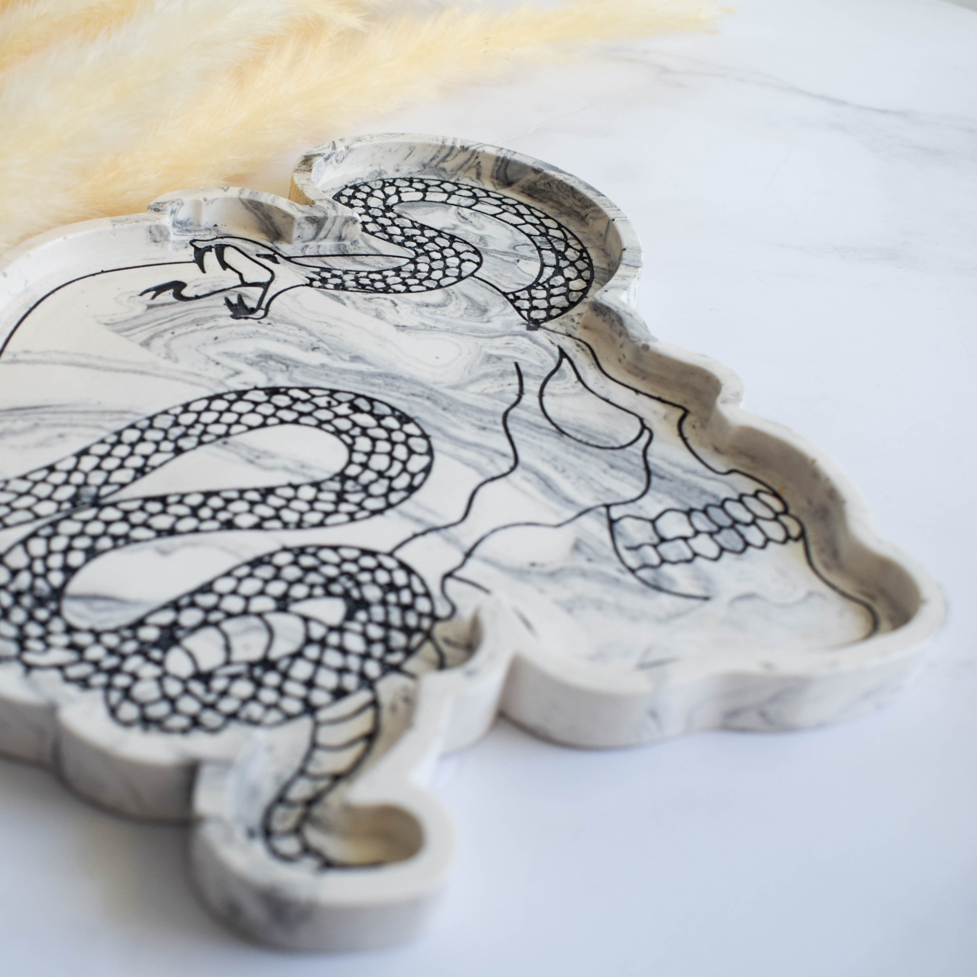 Tác vyrobený z jesmonitu v mramorovém designu. Dominantním prvkem je detailní vzor lebky s hadem, který je ručně vybarven akrylovou černou barvou.