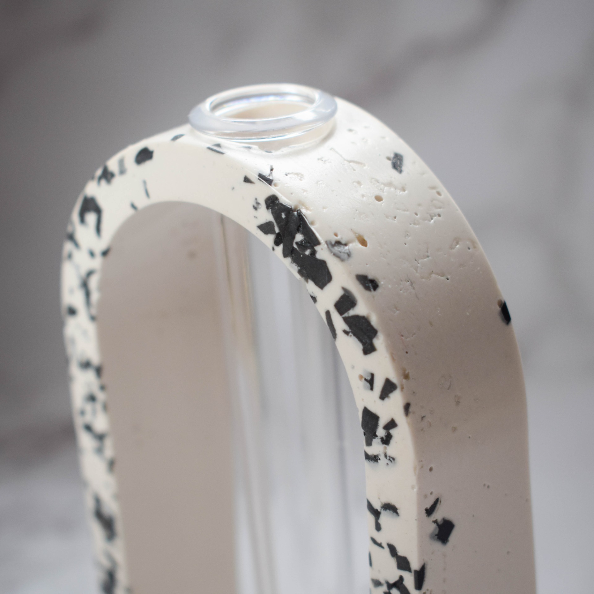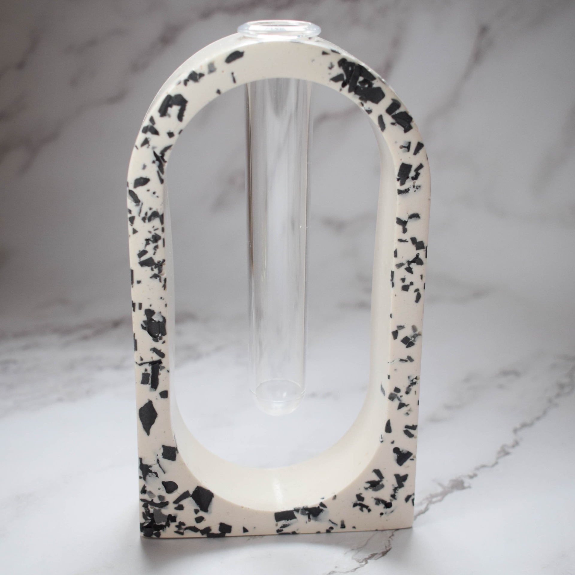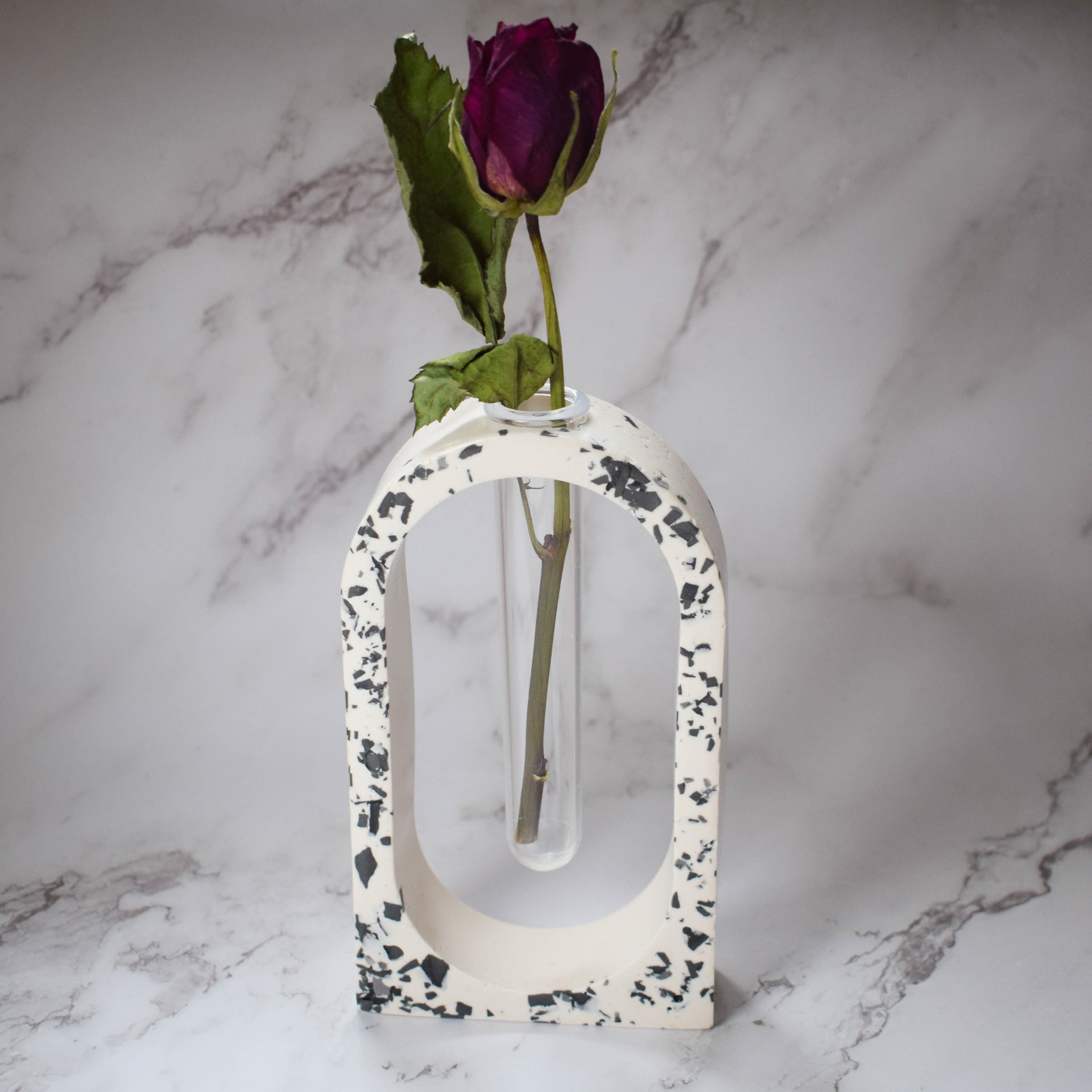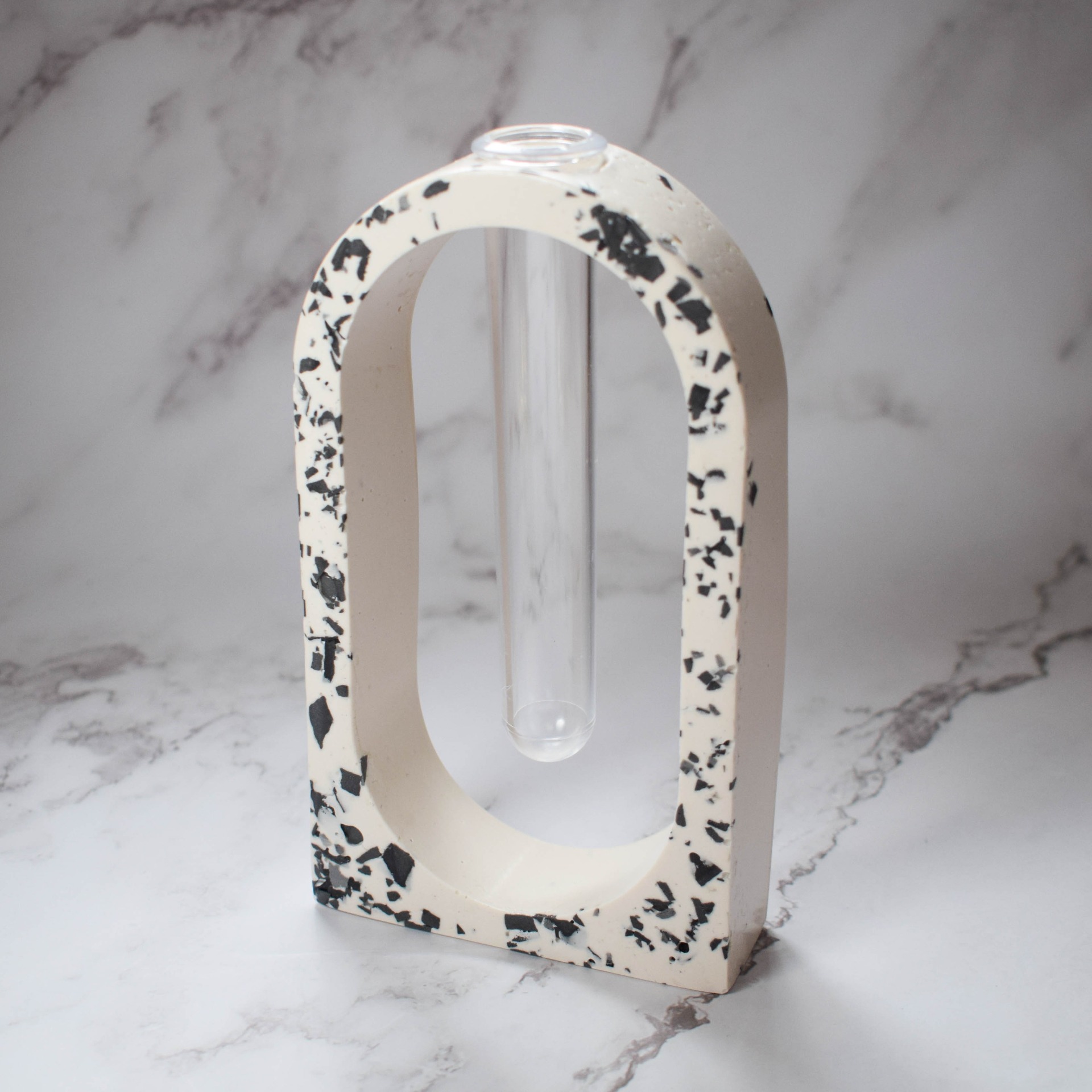 Vázička oválného tvaru vyrobena z jesmonitu, v designu terrazzo. "Zkumavka" je z plastu, lze do ní nalít vodu a přidat kytku. Pozor na velikost kytky, váza by se mohla převrhnout.