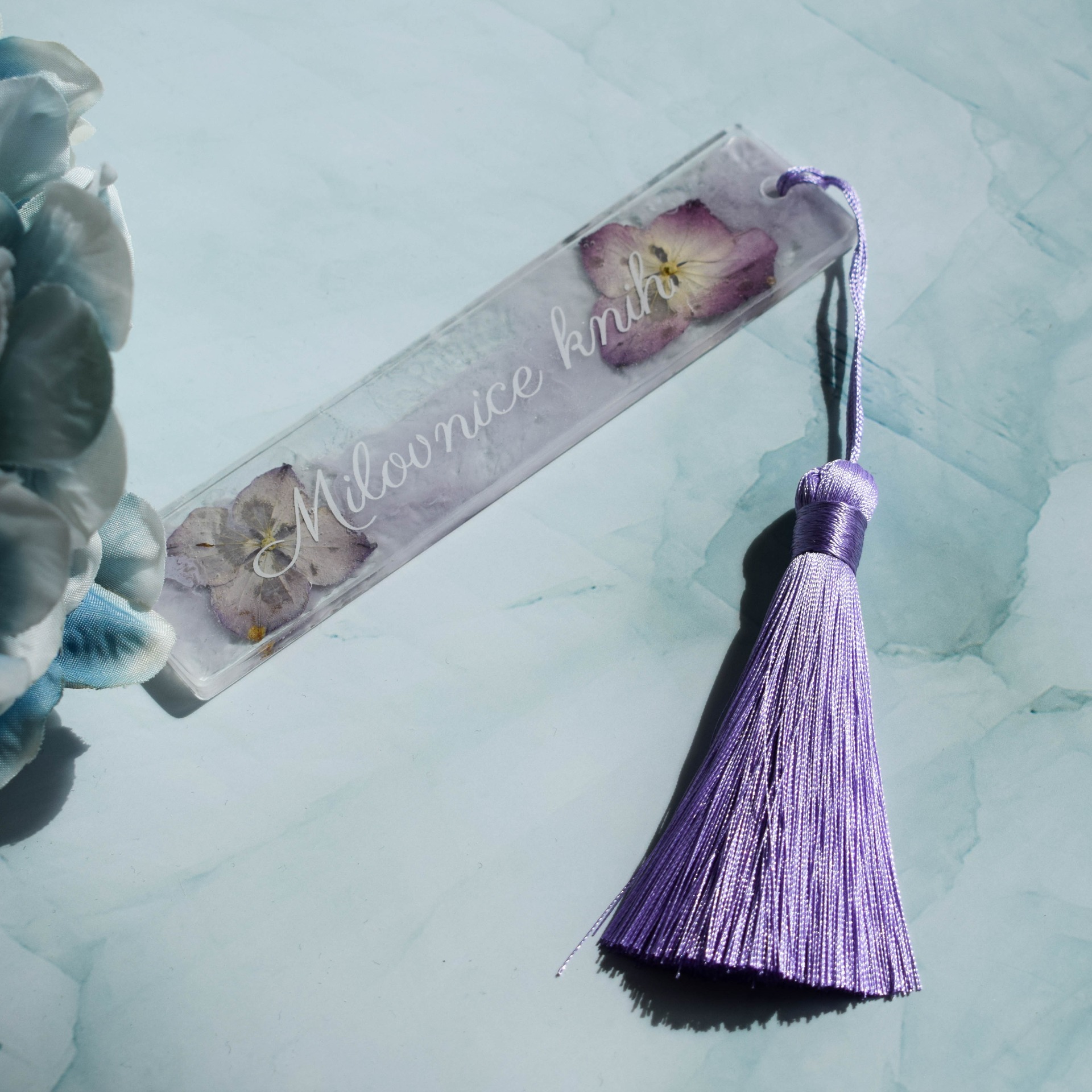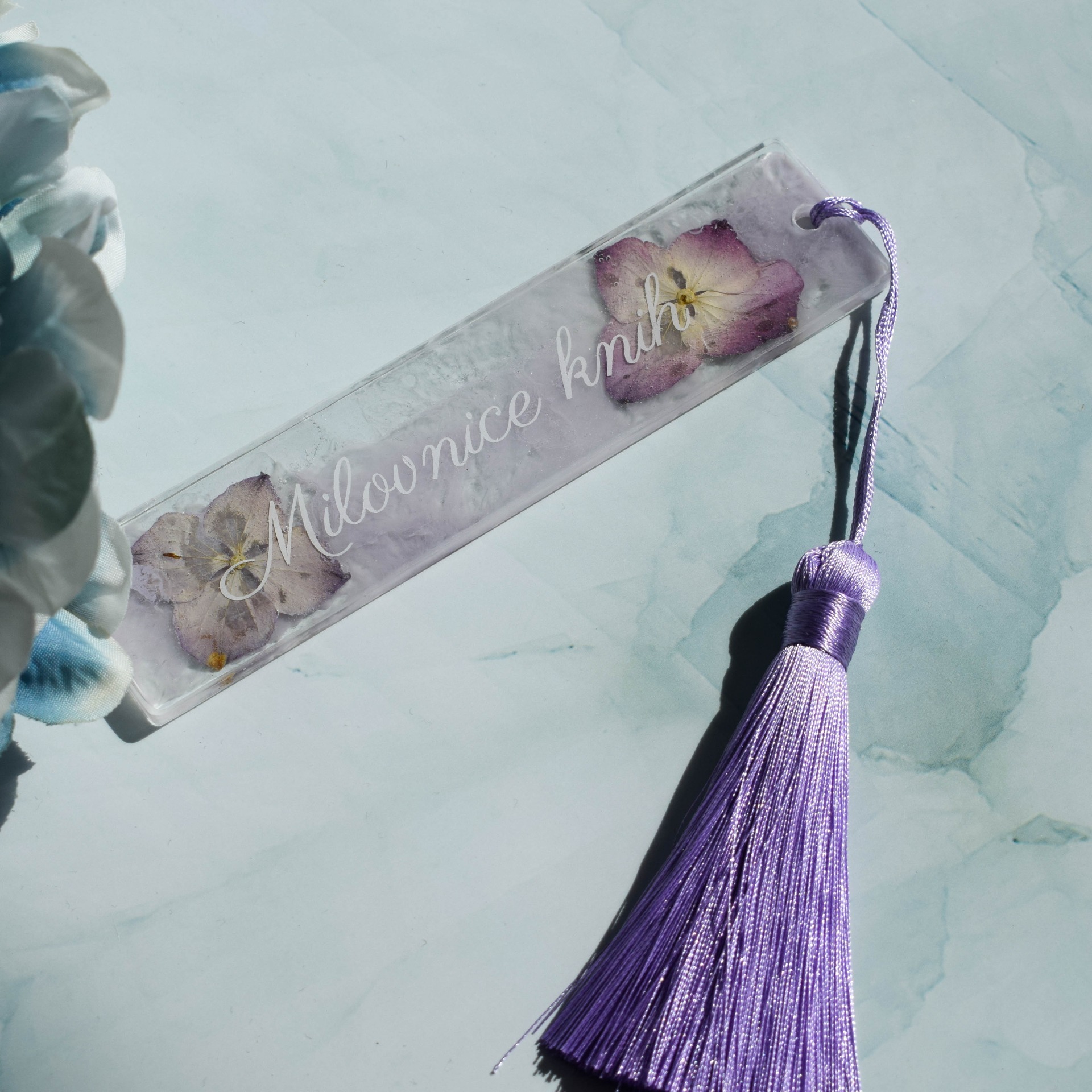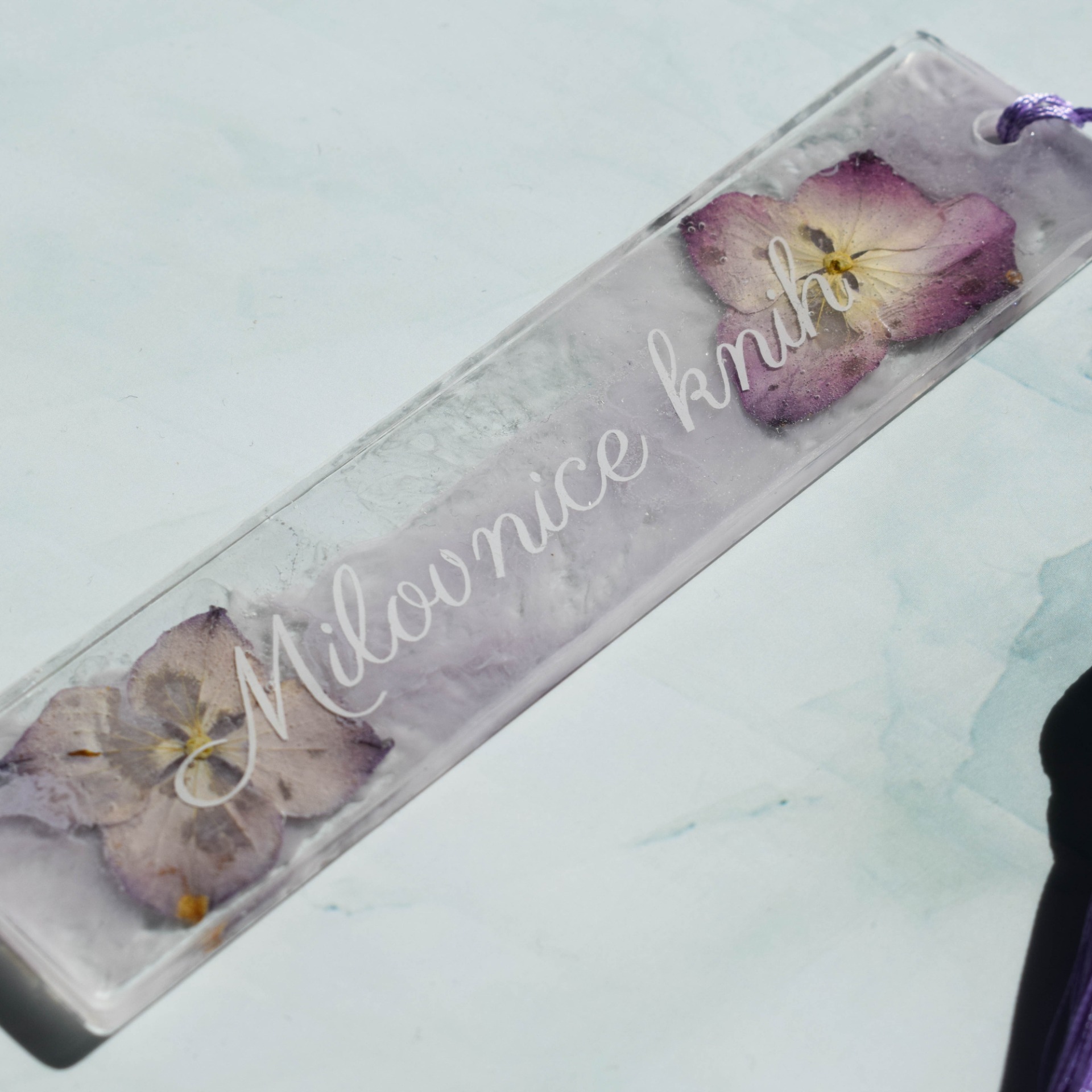 Elegantní záložka vyrobená z průzračné křišťálové pryskyřice, která v sobě ukrývá ručně sušené květy hortenzií, fialový kouřový efekt. Je zde zalitý vyřezávaný nápis Milovnice knih