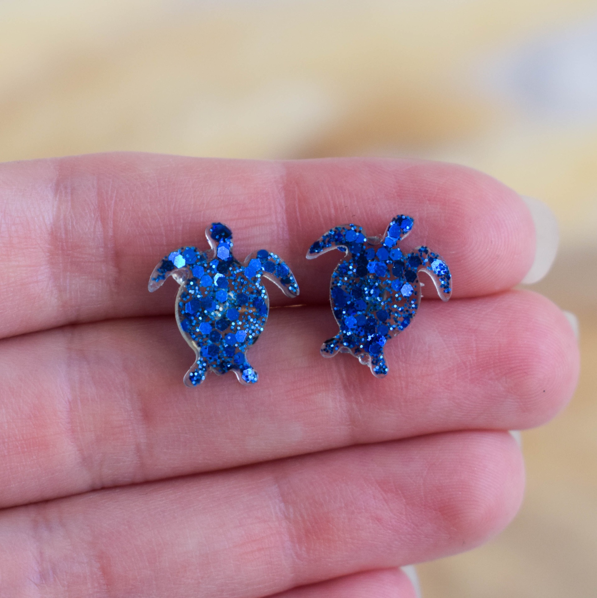 Tyto ručně vyráběné tmavě modré náušnice ve tvaru želviček jsou vytvořeny z pryskyřice a zdobeny glitry, které se lesknou na každém kroku.