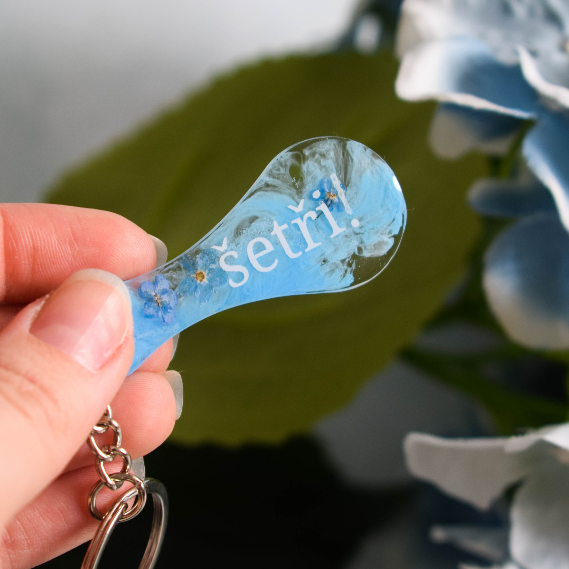 Žetonek do nákupního košíku s ručně trhanými a sušenými pomněnkami, modrým kouřovým efektem a nápisem "šetři!".